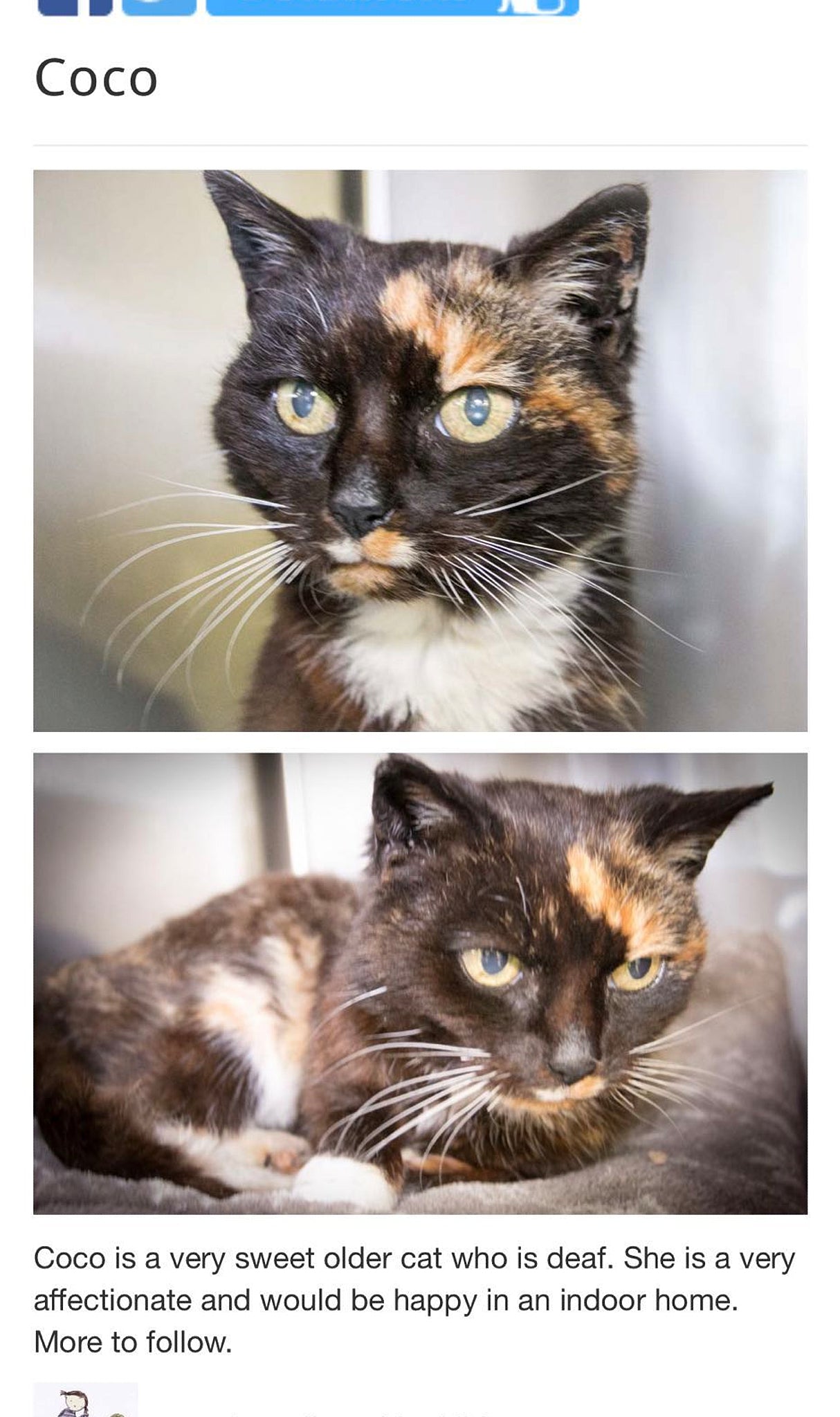 The following days I grew the habit of browsing the shelter’s website consistently. And finally saw a familiar face after 2 weeks —a newly found deaf cat named “Coco.” The shelter had him named after me. Coco is the magic name we share.
